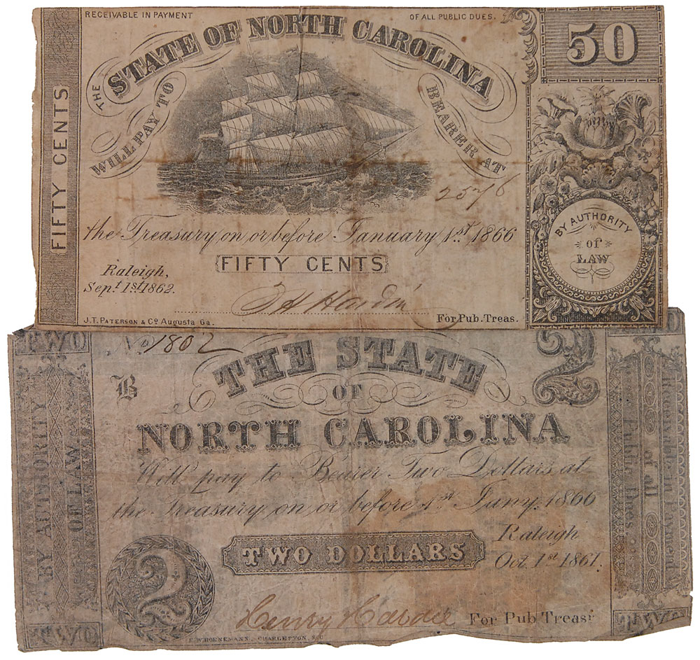 Two Confederate banknotes: state of North Carolina two-dollar bill printed on the reverse of un-issued North Carolinian four-dollar currency, number 1802, issued on October 1, 1861; and a state of North Carolina fifty-cent bill, number 2576, issued on September 1, 1862, featuring a vignette of a ship. Overall creases and soiling, otherwise very good condition. Accompanied by a replica Confederate States of America one-cent coin and a replica anti-Jefferson Davis token, as well as an original circa 1890s Sweet Caporal pinback button honoring Kentucky. RR Auction COA.