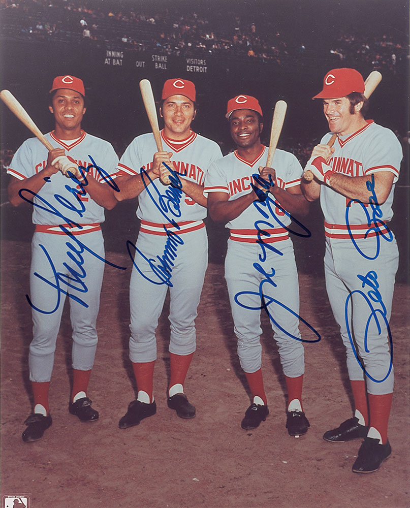 Color glossy 8 x 10 photo of the heart of the famous Cincinnati Reds lineup, signed in blue felt tip by Pete Rose, Johnny Bench, Joe Morgan, and Tony Perez. In fine condition, with edges possibly slightly trimmed. Pre-certified Steve Grad/PSA/DNA and RR Auction COA.
