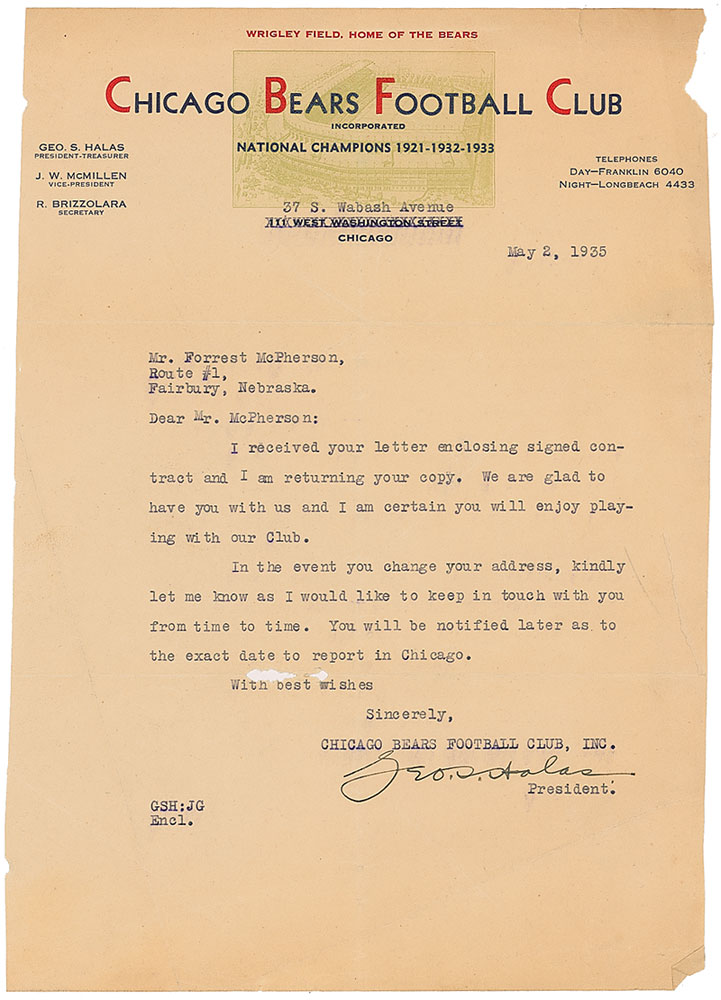 TLS signed “Geo. S. Halas,” one page, 7.75 x 11, Chicago Bears Football Club letterhead, May 2, 1935. Letter to Forrest McPherson, a player about to join the team. In part: “I received your letter enclosing signed contract…We are glad to have you with us and I am certain you will enjoy playing with our Club…You will be notified later as to the exact date to report in Chicago.” In very good condition, with intersecting folds, one through a single letter of signature, a few creases, paper loss to right edge, and uniform toning. McPherson would make his debut with the Bears in 1935 and would be traded to Philadelphia the same season. Pre-certified Steve Grad/PSA/DNA and RR Auction COA.