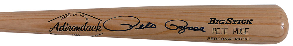Official Adirondack Big Stick Pete Rose personal model baseball bat signed in blue felt tip on the barrel. In very fine condition. Pre-certified Steve Grad/PSA/DNA and RR Auction COA.