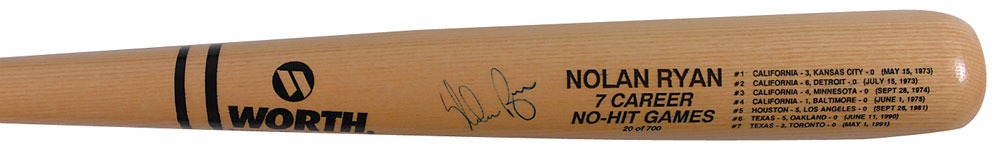 Official limited edition Worth no-hitter commemorative baseball bat, numbered 20/700, listing all seven of Ryan’s no-hitters, signed in blue felt tip on the barrel. In fine condition. Pre-certified Steve Grad/PSA/DNA and RR Auction COA.