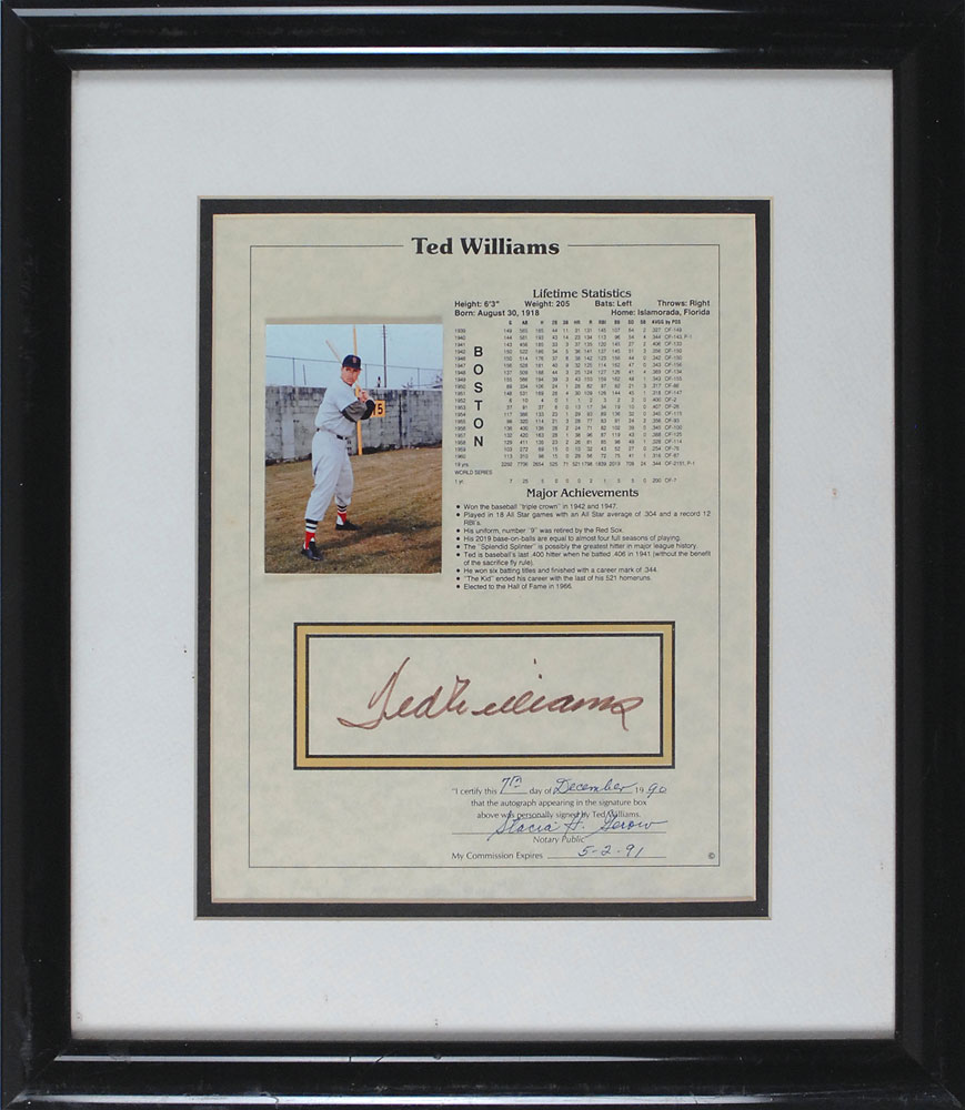 Very nice notarized career stat sheet, 8 x 10, detailing all of Williams’s stats and major achievements, bearing a color baseball card-size photo of Williams affixed to the left side, signed in black felt tip in a special signature area. Double-matted and framed to an overall size of 13.5 x 15.5. In fine condition. Pre-certified Steve Grad/PSA/DNA and RR Auction COA.