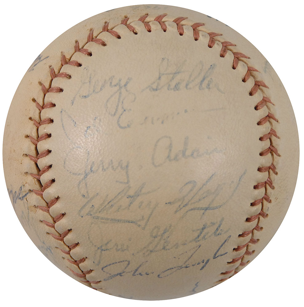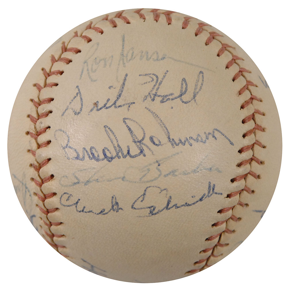 Baltimore Orioles souvenir baseball signed in blue ink on the sweet spot and side panels by 20 members of the 1962 Orioles team. Signers include: Brooks Robinson, Whitey Herzog, Dick Williams, Bill Hitchcock (ss), Harry Breechen (ss), Milt Pappas, Jim Gentile, Johnny Temple, George Steller, Jerry Adair, Ron Hansen, Dick Hall, Steve Barber, Chuck Estrada, Wes Stock, Jackie Brandt, Hal Brown, Gus Triandos, and Hobie Landrith. Baseball also bears a ballpoint notation dating it to 1962. Various signatures a few shades light, otherwise fine condition; Brooks Robinson’s signature, however, is quite strong. Pre-certified Steve Grad/PSA/DNA and RR Auction COA.