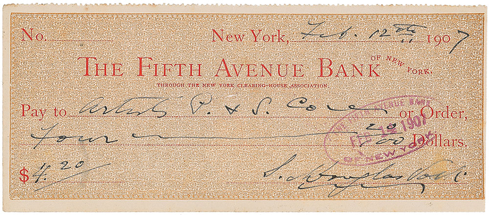 American portrait and landscape painter (1856–1935). Fifth Avenue Bank check, 6.5 x 2.75, filled out and signed by Volk, “S. A. Douglas Volk,” payable to Artists’ P. & S. Co. for $4.20, February 12, 1907. A central vertical fold, expected cancellation cuts and stamps, and a small stain affecting a letter in his last name, otherwise fine condition. RR Auction COA.