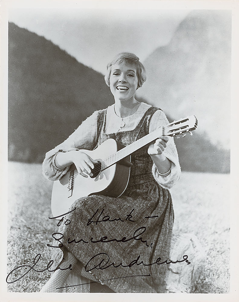 Glossy 8 x 10 photo of Andrews singing in The Sound of Music, signed and inscribed in black felt tip, “To Hank—Sincerely, Julie Andrews.” In fine condition. Pre-certified PSA/DNA and RR Auction COA.