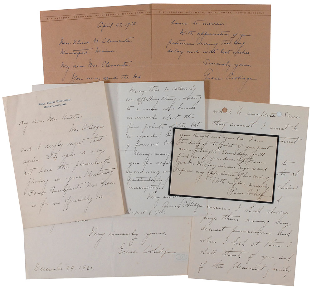 Collection of five ALSs, each signed in full, dated between 1920 and 1938, including one as first lady on White House letterhead. The ALS as first lady reads, in part: “I am sincerely thinking of adding a chapter…taking as my subject ‘As a White Court Guest.’ I should make a good story of it which would not be better than you deserve—it couldn’t be.” Another, on both sides of a black-bordered mourning card dated shortly after Calvin Coolidge’s death, in part: “This is a short note because I have so many to write…I do want you to know how much I appreciate your thought and your love.” Two letters are accompanied by their original mailing envelopes filled out in Coolidge’s hand, one including a franking signature in the upper right. Also includes an unrelated mailing envelope bearing her franking signature. In overall fine condition. RR Auction COA.