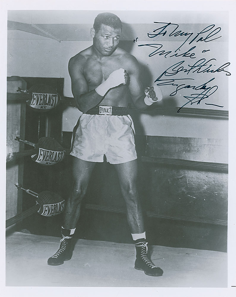 Glossy 8 x 10 photo of Robinson in a pugilistic pose in the ring, signed and inscribed in black felt tip, “To my pal ‘Mike’ Best wishes, Sugar Ray Robinson.” In fine condition, with a few light surface marks and impressions. Pre-certified Steve Grad/PSA/DNA and RR Auction COA.