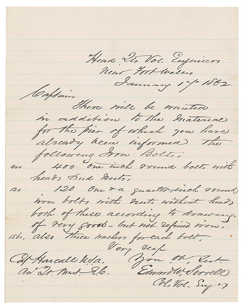 Engineer for the Union during the Civil War (1826–1906) known for his work on the ‘Marsh Battery’ during the Second Battle of Charleston Harbor. War-dated ALS signed “Edward W. Serrell, Col. Vol. Engrs,” one page, lightly-lined, 7.75 x 9.5, January 17, 1862. Letter to Assistant Quartermaster Captain Hascall. In part: “There will be wanted in addition to the material for the pier which you have already been informed the following Iron bolts. 400 one inch round bolts with heads and nuts, 120 one & a quarter inch round iron bolts with nuts without heads.” In fine condition. RR Auction COA.