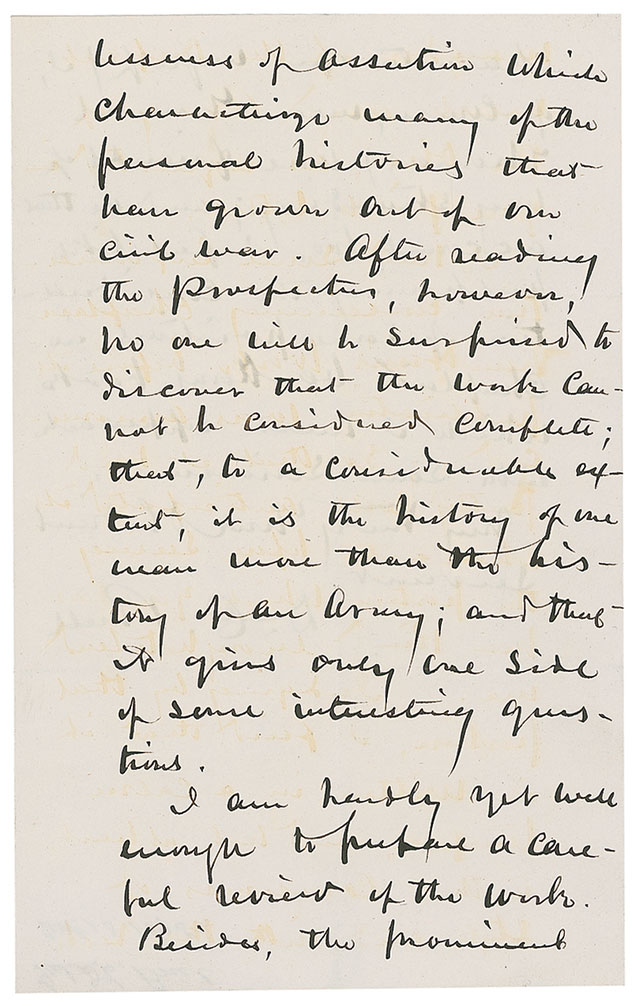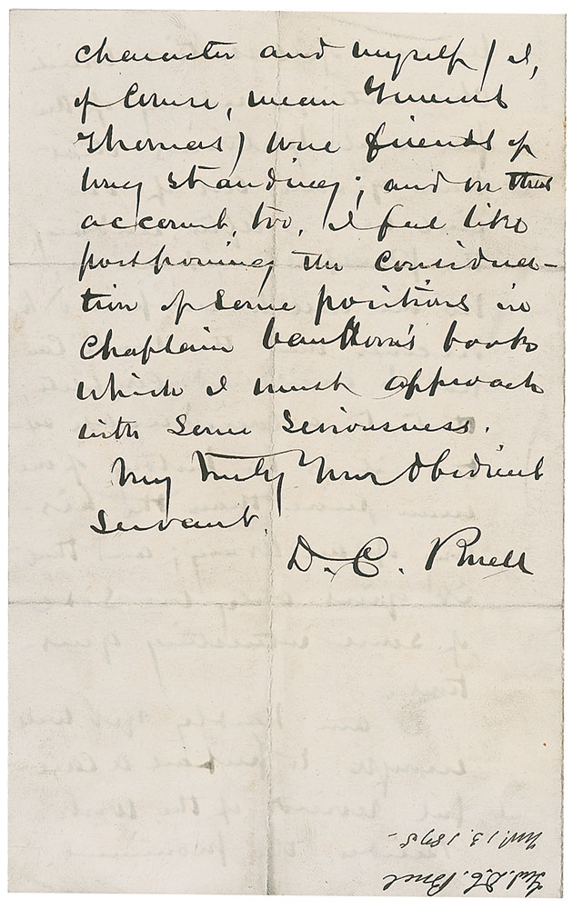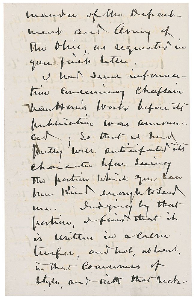 American military officer (1818–1898) who served in the Seminole, Mexican-American, and Civil Wars. His actions in the last were the source of much controversy, and he was ultimately relieved of command for his failure to pursue Bragg’s withdrawal following the Battle of Perryville in 1862. ALS signed “D. C. Buell,” four pages on two adjoining sheets, 5 x 7.75, November 13, 1875. Letter to the publishers of The History of the Civil War. In part: “I had some information concerning Chaplain Van Harris’ work before its publication was announced; so that I had pretty well anticipated its character before seeing the portion which you have been kind enough to send me. Judging by that portion, I find that it is written in an calm temper…and not, at best, in that coarseness of style, and with that recklessness of assertion which characterizes many of the personal histories that have grown out of our Civil War…Besides, the prominent character and myself (I of course mean General Thomas) were friends of long standing.” In fine condition. RR Auction COA.