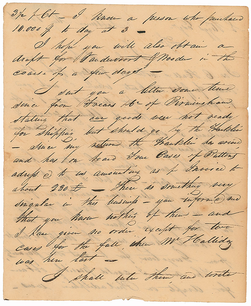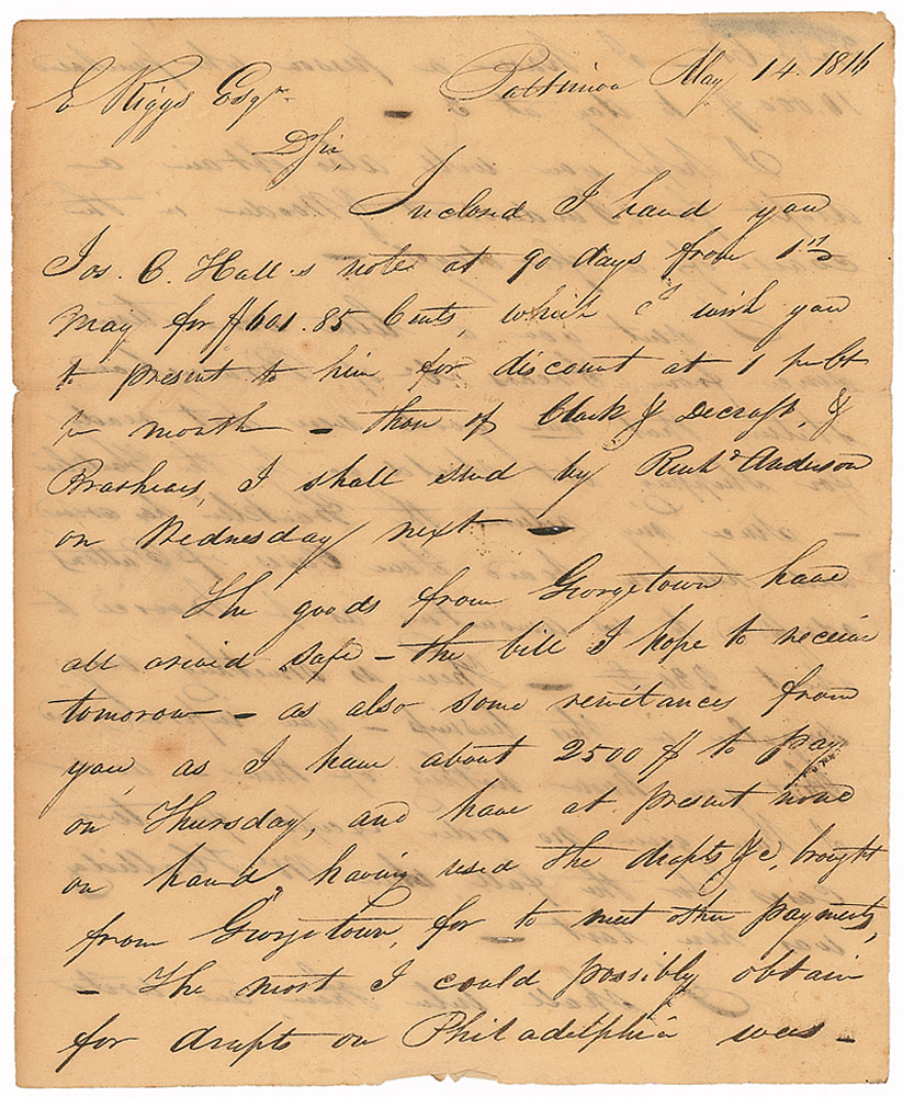 Pioneering American entrepreneur and philanthropist (1795–1869) who lent his support to such venerable institutions as the Peabody Institute in Baltimore and the Peabody Essex Museum in Salem, Massachusetts. Scarce ALS signed “Geo. Peabody,” three pages on two sheets, 7.75 x 9.5, May 14, 1816. Letter to Elisha Riggs. In part: “The goods from Georgetown have all arrived safe—the bill I hope to receive tomorrow—as also some remittances from you, as I have about 2500$ to pay on Thursday, and have at present none on hand…The most I could possibly obtain for drafts on Philadelphia was 3 1/2 per Ct—I know a person who purchased 10,000$ today at 3.” In very good condition, with intersecting folds, one through a single letter of signature, uniform toning, and paper loss to right edge of second page from wax seal. RR Auction COA.