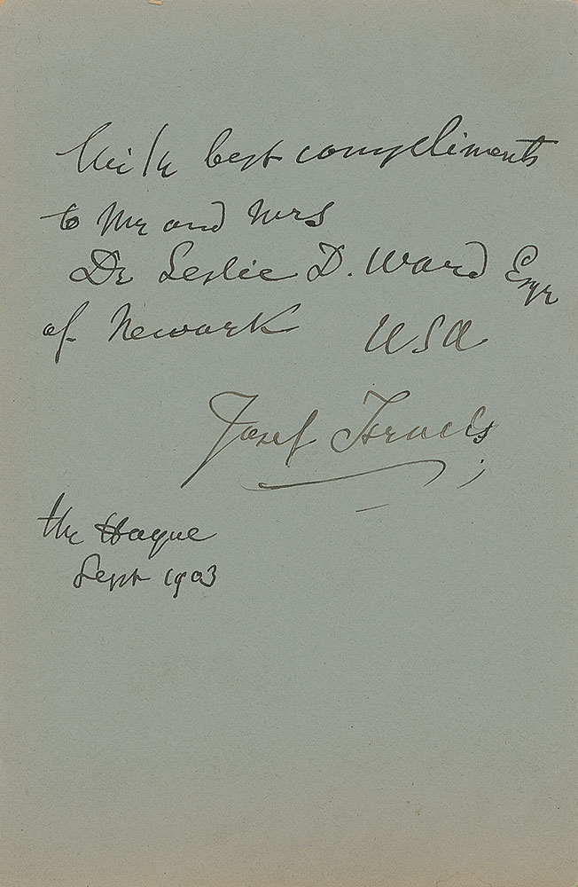Highly respected Dutch painter (1824–1911). Original 4.25 x 6.5 cabinet photo by Kameke, signed and inscribed on the reverse in black ink, “With best compliments to Mr. and Mrs. Dr. Leslie D. Ward Esqr. of Newark, USA, Jozef Israels, The Hague, Sept 1903.” In fine condition. RR Auction COA.
