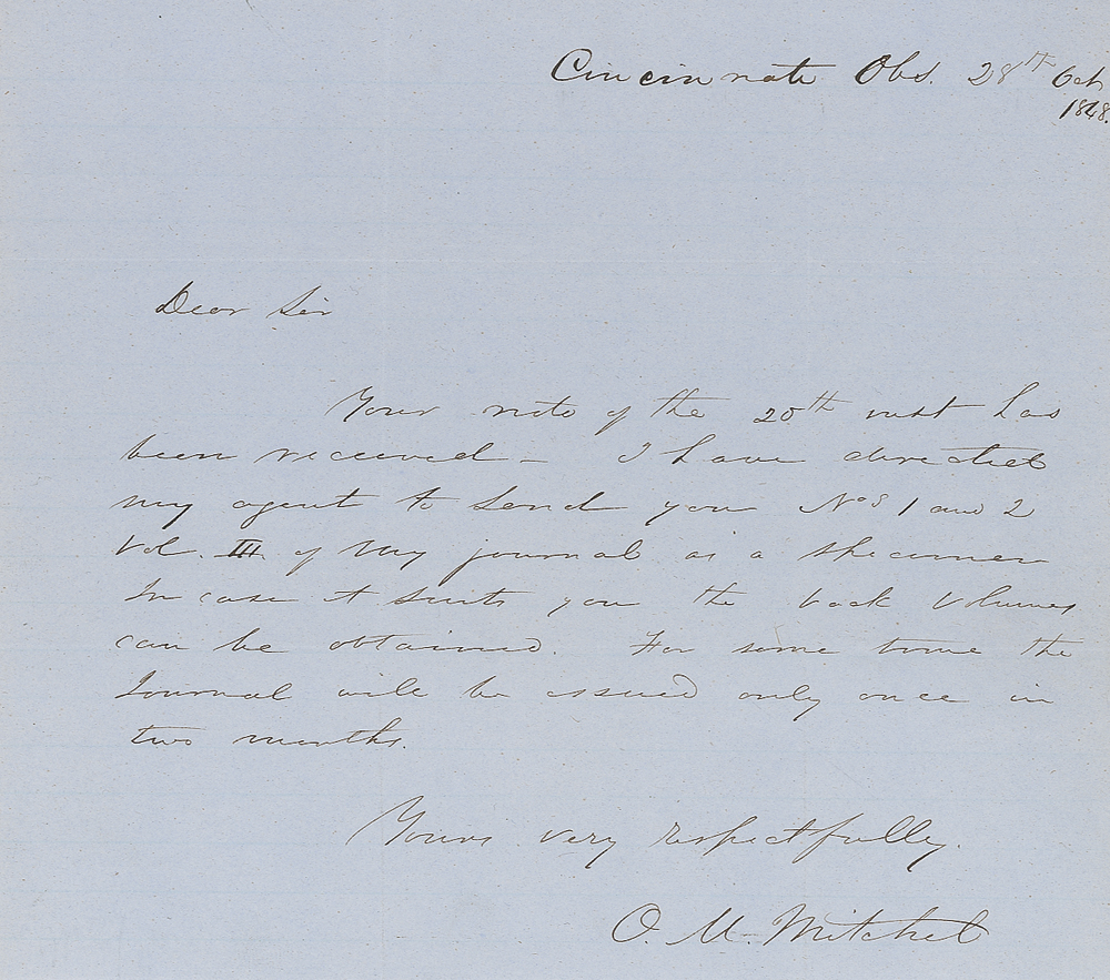 Union officer and astronomer (1810–1862). Uncommon ALS signed “O. M. Mitchel,” one page, 7.75 x 7, October 28, 1848. Letter to an unidentified recipient with regard to samples of his astronomical journal Sidereal Messenger. In part: “I have directed my agent to send you Nos. 1 and 2, Vol. III of my journal as a specimen. In case it suits you the back volumes can be obtained.” In fine condition, with intersecting folds, one through a single letter of signature. RR Auction COA.