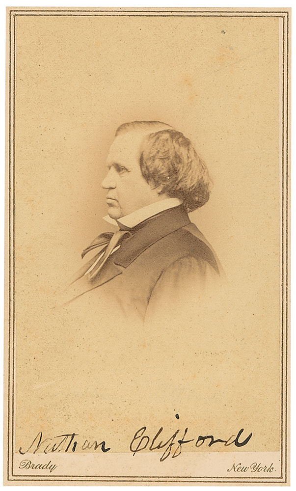 American statesman, diplomat, and jurist, whose career culminated in a lengthy period of service as an associate justice of the Supreme Court (1803–1881). Original 2.25 x 4 carte-de-visite bust portrait of Clifford in profile, signed at the bottom of the image in black ink, “Nathan Clifford.” Published by Brady of New York. In fine condition, with a skinned back. RR Auction COA.