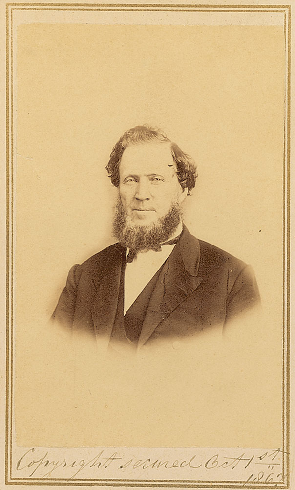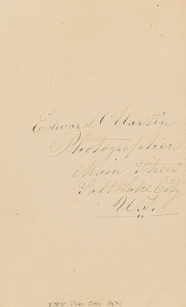 Notable photographer (1818–1882) who opened his Salt Lake City gallery in 1865. Original 2.25 x 4 carte-de-visite portrait of Brigham Young, notated in the lower border, “Copyright secured Oct. 1st 1867,” and signed on the reverse by the photographer, “Edward C. Martin, Photographer, Main Street, Salt Lake City, U. T.” In fine condition. RR Auction COA.