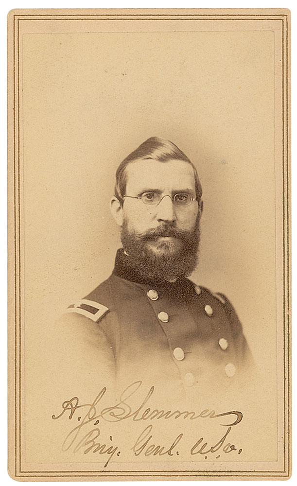 Army officer (1828–1868) during the Seminole Wars, Civil War, and Old West. Original 2.25 x 4 carte-de-visite bust portrait of Slemmer in uniform, signed in black ink, “A. J. Slemmer, Brig. Gen’l U.S.A.” Published by Hoag & Quicks of Cincinnati. In fine condition. RR Auction COA.