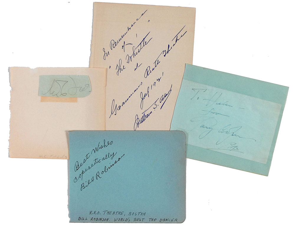 Vintage ink and pencil signatures on various size album pages and slips. Signers are Bill Robinson, Gary Cooper (ins), William S. Hart (ins), and W. C. Fields, on a closely trimmed slip affixed to an album page. In overall fine condition, with closely trimmed right edge to Fields’s signature. RR Auction COA.