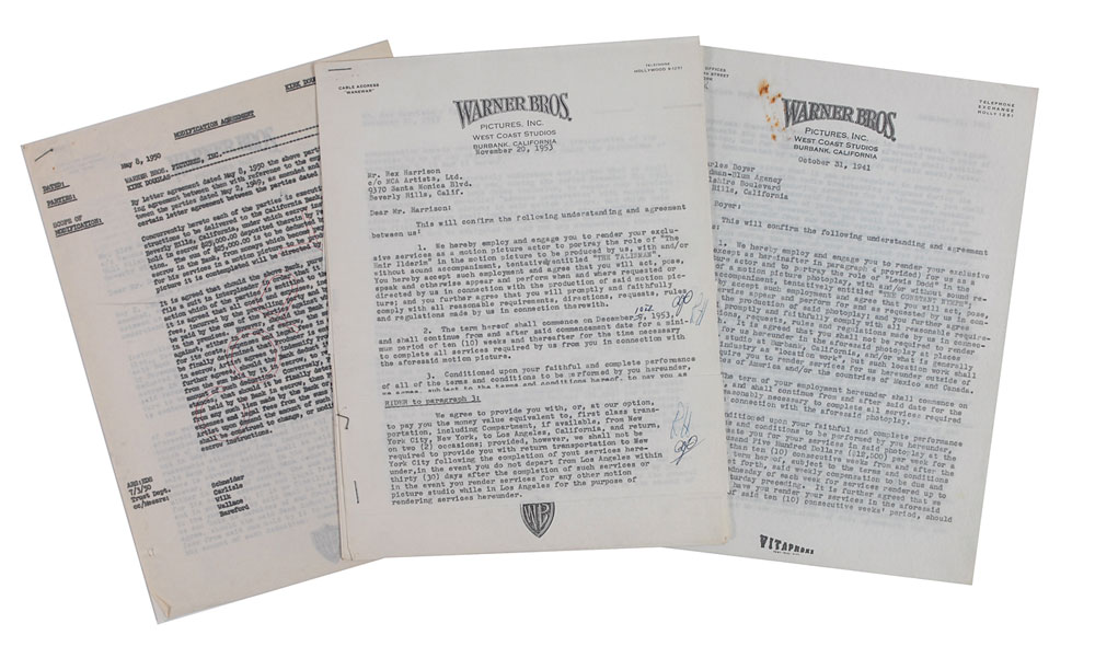 Collection of three documents: one signed by Rex Harrison, six pages, 8.5 x 11, November 20, 1953. Agreement between Harrison and Warner Bros. for him “to portray the role of ‘The Emir Ilderim’ in the motion picture…tentatively entitled ‘The Talisman.’” One signed by Kirk Douglas, two pages, 8.5 x 11, May 8, 1950. Agreement between Douglas and Warner Bros. regarding $25,000 in escrow payable by Paramount Picture for Douglas’s services in a “motion picture it is contemplated will be directed by Mr. William Wilder.” And a third signed by Charles Boyer, seven pages, 8.5 x 11, October 31, 1941. Agreement between Boyer and Warner Bros. for him “to portray the role of ‘Lewis Dodd’ in the production of a motion picture photoplay…tentatively titled ‘The Constant Nymph.’” In overall fine condition, with expected document wear and a couple rusty paperclip marks. RR Auction COA.