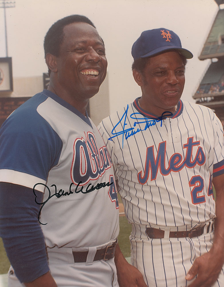 Color satin-finish 11 x 14 photo of Hank Aaron in his Atlanta uniform and Willie Mays in his Mets uniform, signed in black felt tip by Aaron and in blue felt tip by Mays. In fine condition. Pre-certified Steve Grad/PSA/DNA and RR Auction COA.