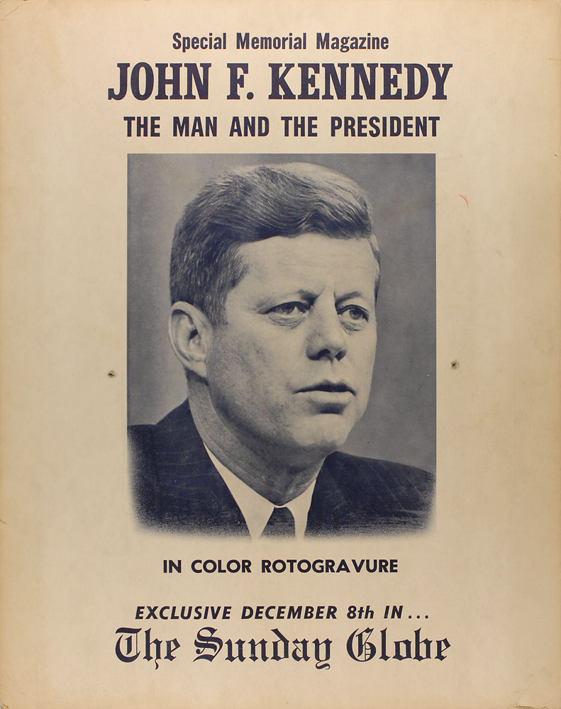 Two items: original 22 x 28 newspaper stand placard featuring the slain president’s portrait advertising their exclusive memorial magazine to be included with the December 8 [1963] issue of The Sunday [Boston] Globe; and an unsigned color satin-finish 16 x 20 photo of Kennedy at the helm of his sailboat. In very good condition, with two mounting holes and scattered soiling to placard and rippling and spotting to photo. RR Auction COA.