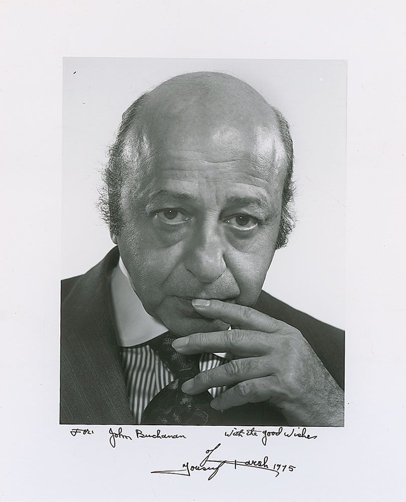 Glossy 8 x 10 portrait of the famed photographer, boldly signed and inscribed in the lower border in black ink, “For John Buchanan, with the good wishes of Yousuf Karsh, 1975.” In fine condition, with a few unobtrusive surface creases. RR Auction COA.