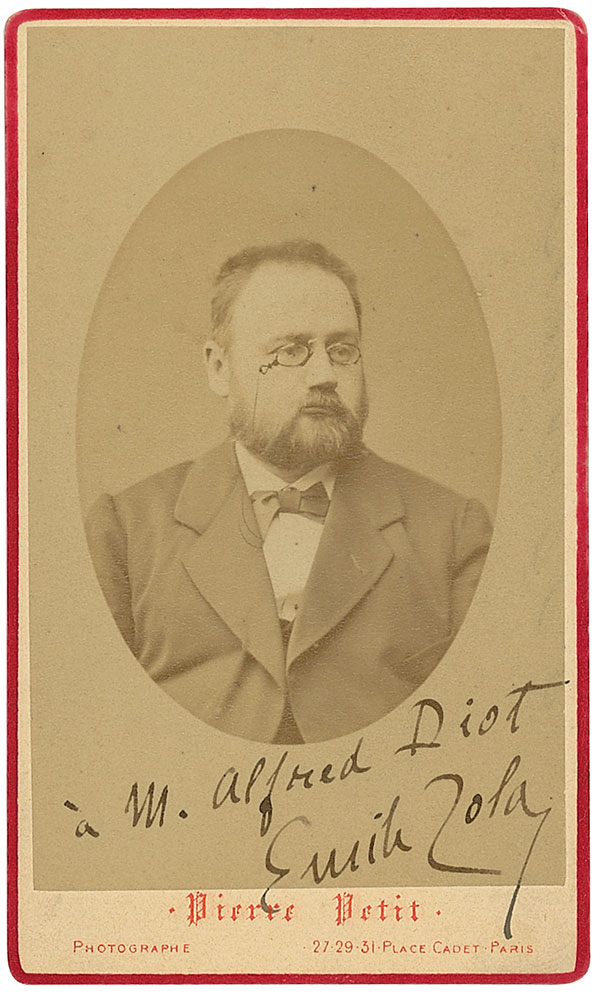 Prolific French journalist, novelist, and activist (1840–1902) best known as one of the leading figures of naturalism. Original 2.5 x 4 carte-de-visite bust portrait of Zola wearing glasses, signed and inscribed at the bottom of the image in black ink, “A M. Alfred Riot, Emile Zola.” Published by Pierre Petit of Paris. In fine to very fine condition. Pre-certified PSA/DNA and RR Auction COA.