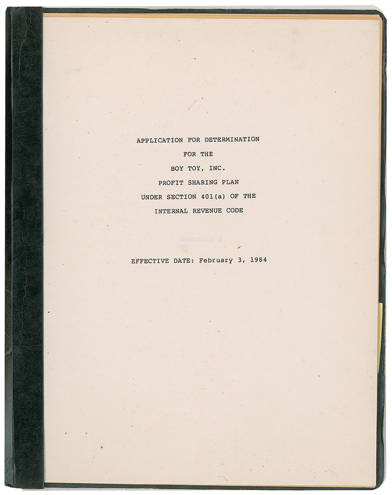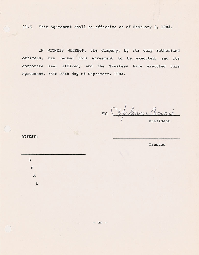 DS, signed “Madonna Ciccone,” 20 pages, 9 x 11.5, September 28, 1984. Profit sharing trust agreement “between Boy Toy, Inc., a corporation duly organized and existing under the laws of the State of New York…and Madonna Ciccone as Trustee,” effective retroactively to February 3, 1984, setting guidelines for financial matters including insurance, annuities, investments, and powers of the board of trustees. Document is contained within its original folder. In fine condition, with a paperclip impression to the upper right of the last few pages. The company was established to specialize in Madonna music videos, films, and merchandise—and its eponym, Madonna’s ‘Boy Toy’ belt buckle, infamously appeared in the ‘Like a Virgin’ music video. She had debuted ‘Like a Virgin’ at the first MTV Video Music Awards on September 14, 1984—just two weeks before signing this document—and it went on to become her first number-one hit, launching her into worldwide stardom. An incredible document from a defining moment of her career. Pre-certified Roger Epperson/REAL and RR Auction COA.
