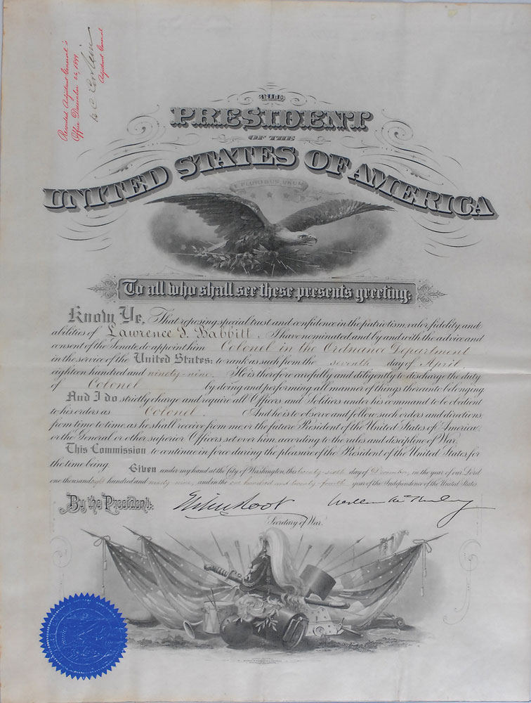 Partly-printed vellum DS as president, one page, 14.75 x 19.5, December 26, 1899. President McKinley appoints Lawrence S. Babbitt as a “Colonel in the Ordinance Department in the service of the United States.” Boldly signed at the conclusion by McKinley and countersigned by Secretary of State Elihu Root. Blue seal affixed to lower left remains fully intact with a few creases. In fine condition, with intersecting folds (one vertical fold passing through a single letter of the signature), slight show-through to left border from mounting strip affixed to reverse, and a surface impression along top edge; both signatures are exceptionally bold. Pre-certified John Reznikoff/PSA/DNA and RR Auction COA.