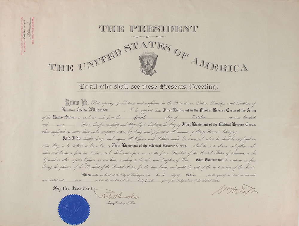 Partly-printed DS as president, signed “Wm. H. Taft,” one page, 21 x 16, October 4, 1909. President Taft appoints Norman Eccles Williamson as “First Lieutenant in the Medical Reserve Corps of the Army of the United States.” Crisply signed at the conclusion by Taft and countersigned by acting Secretary of War Robert Shaw Oliver. Blue War Office seal affixed to lower left remains fully intact. Overall creases, otherwise fine condition. Pre-certified John Reznikoff/PSA/DNA and RR Auction COA.