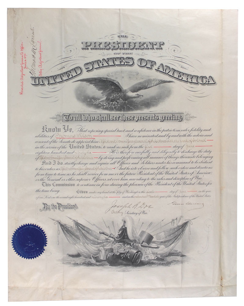Partly-printed DS as president, one page, 15.5 x 19.5, June 6, 1896. President Cleveland appoints Thomas Wilson as an “Assistant Commissary General of Subsistence with the rank of Colonel in the service of the United States.” Signed at the conclusion by Cleveland and countersigned by acting Secretary of War Joseph B. Doe. Blue War Office seal affixed to lower left remains crisp and fully intact. Intersecting folds (one vertical fold passing through a single letter of the signature), irregular toning and a few small holes to rightmost vertical fold, and some scattered adhesive remnants, otherwise fine condition. Pre-certified John Reznikoff/PSA/DNA and RR Auction COA.