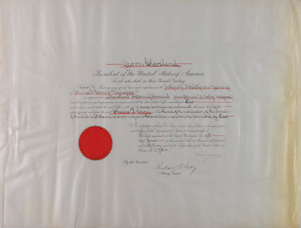 Partly-printed DS as president, one page, 24.75 x 18.75, June 19, 1893. President Cleveland appoints Charles B. Howry of Mississippi as “Assistant Attorney General…until the end of the next session of the Senate of the United States.” Signed at the conclusion by Cleveland and countersigned by Attorney General Richard Olney. Red Department of Justice seal affixed to lower left remains fully intact. Scattered creases and moderate toning to right border, otherwise fine condition. Pre-certified John Reznikoff/PSA/DNA and RR Auction COA.