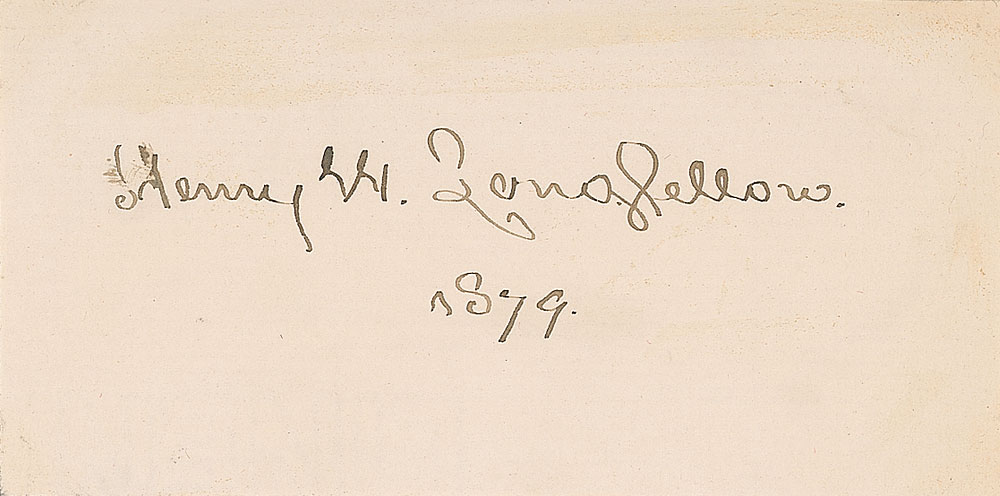 Ink signature, “Henry W. Longfellow, 1879,” on an off-white 4.5 x 2.25 card. In fine condition, with slight brushing to signature. RR Auction COA.