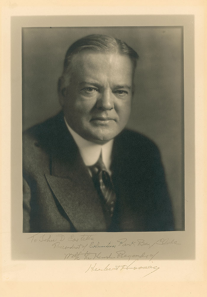 Vintage matte-finish 9.25 x 13.25 portrait of Hoover by Harris and Ewing, signed and inscribed in the lower border in black ink, “To John D. Costello, President of the Columbia Park Boys’ Club, With the kind regards of Herbert Hoover.” In fine condition, with the signature and inscription a few shades light. Pre-certified John Reznikoff/PSA/DNA and RR Auction COA.
