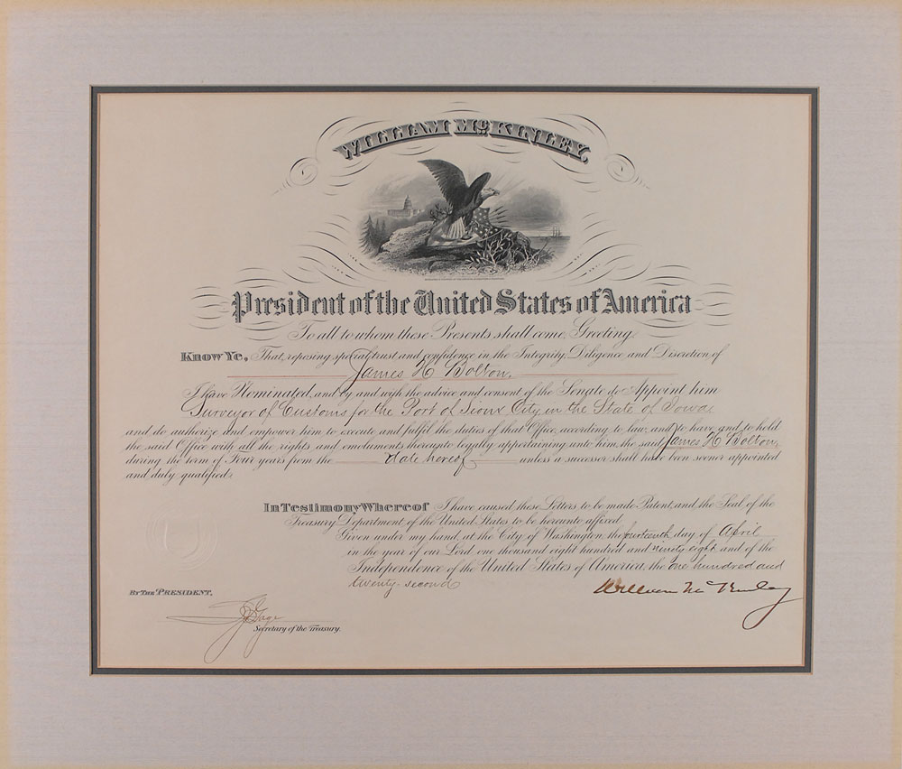 Partly-printed DS as president, one page, 16.5 x 13.25, April 14, 1898. President McKinley appoints James H. Bolton as “Surveyor of Customs for the Port of Sioux City, in the State of Iowa.” Boldly signed at the conclusion by McKinley and countersigned by Secretary of the Treasury Lyman J. Gage. Double-matted to an overall size of 21.25 x 18. In fine condition, with some slight brushing to start of McKinley’s signature; otherwise the document is unusually crisp and clean. Pre-certified John Reznikoff/PSA/DNA and RR Auction COA.