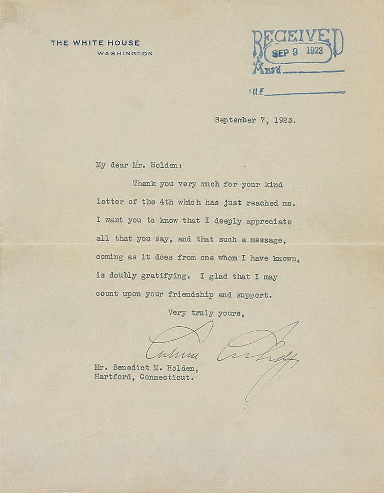 TLS as president, one page, 7 x 9.25, White House letterhead, September 7, 1923. Letter to Benedict Holden. In part: “I want you to know that I deeply appreciate all that you say, and that such a message, coming as it does from one whom I have known, is doubly gratifying. I am glad that I may count upon your friendship and support.” In fine condition, with an office stamp to top right and a mild shade of overall toning. Pre-certified John Reznikoff/PSA/DNA and RR Auction COA.