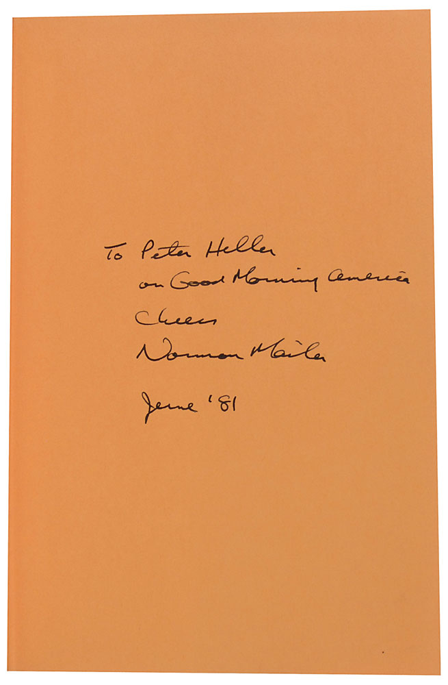 Signed book: The Executioner’s Song. Later printing. Boston: Little, Brown and Company, 1979. Hardcover with dust jacket, 6.25 x 9.5, 1050 pages. Signed and inscribed on the first free end page, “To Peter Heller on Good Morning America. Cheers, Norman Mailer June ’81.” In fine condition. RR Auction COA.