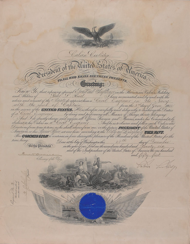 Partly-printed DS as president, one page, 15.5 x 20, December 27, 1926. President Coolidge appoints Paul L. Reed “a Civil Engineer in the Navy with the rank of Captain.” Signed at the conclusion by Coolidge and countersigned by Secretary of the Navy Curtis Wilbur. Intersecting folds, scattered light creases, and moderate dampstaining to upper portion of document, otherwise very good condition. The blue seal is worn and lightly creased, but intact. Pre-certified John Reznikoff/PSA/DNA and RR Auction COA.