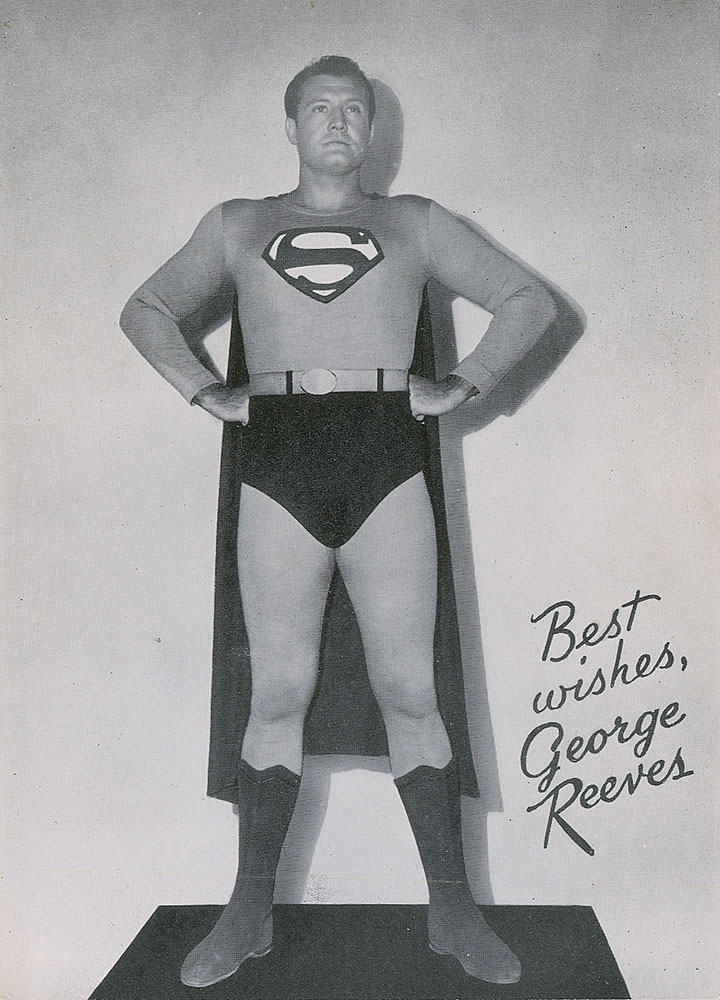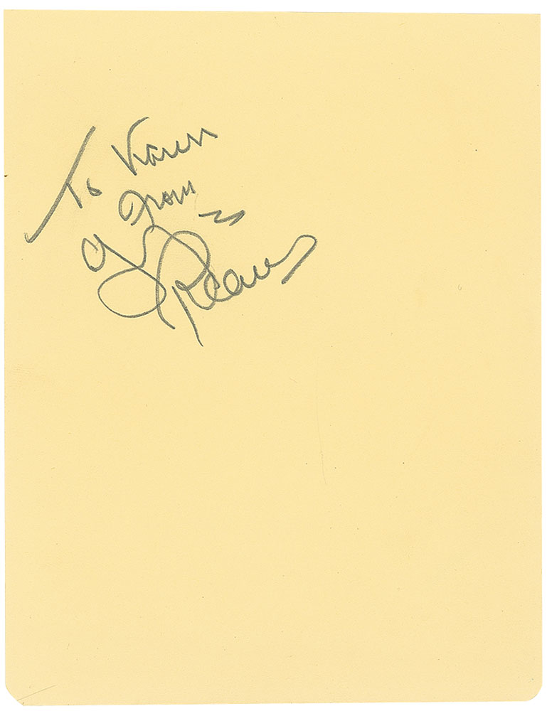 Actor (1914–1959) best remembered for his role as Superman in the popular 1950s television series. His homicide at the age of 45 remains one of the great unsolved mysteries of Hollywood lore. Vintage pencil signature, “To Karen from George Reeves,” on a yellow 4.5 x 6 album page. In fine condition. Signature was obtained while Reeves was attending a public gathering for the Johnnie Walkers Men’s Clothing stores in Milwaukee, and acquired by the consignor’s father, who transported Reeves to and from the airport. Accompanied by a 5 x 7 publicity photo of Reeves as Superman, bearing a pre-printed signature, personally given to the autograph recipient by Reeves. Pre-certified PSA/DNA and RR Auction COA.