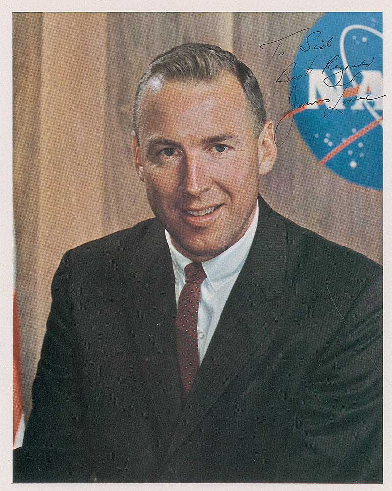 Color vintage 8 x 10 NASA photo of Lovell in a suit and tie, signed and inscribed in black ink, “To Sid, Best regards, James Lovell.” In fine condition. Pre-certified Steve Zarelli and RR Auction COA.