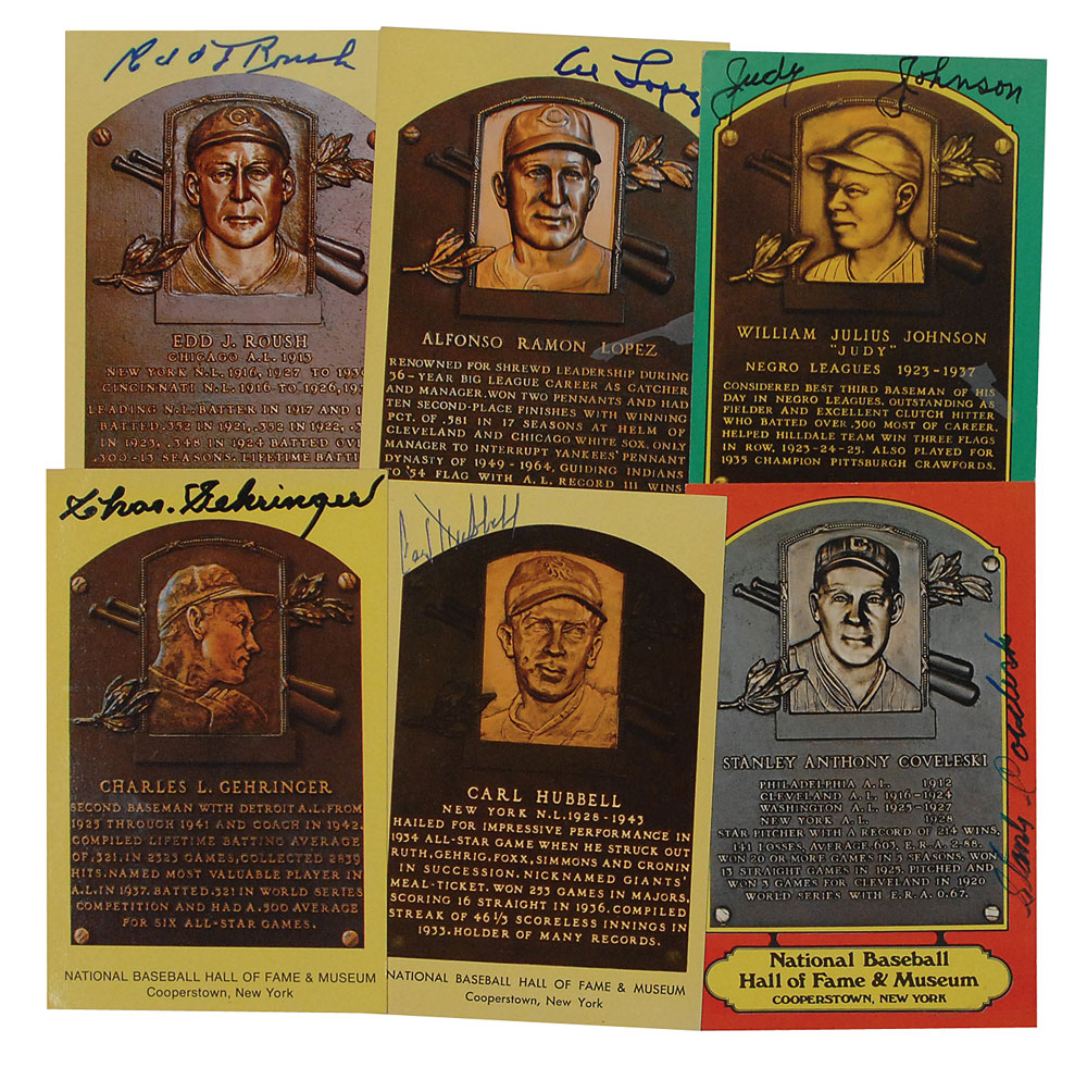 Six Hall of Fame cards, four gold and two color, each signed at the top in ink or felt tip by the Hall of Famer pictured: Stan Coveleski, Judy Johnson, Chas. Gehringer, Al Lopez, Edd Roush, and Carl Hubbell. In fine condition. Pre-certified Steve Grad/PSA/DNA and RR Auction COA.