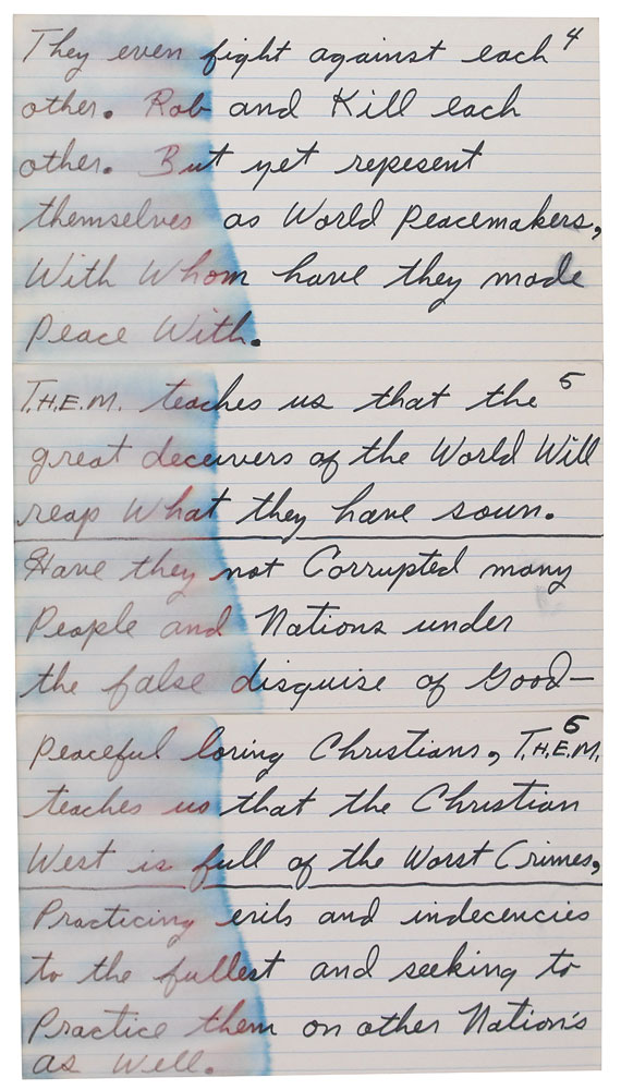 Handwritten notes, three off-white 8 x 5 lined cards, no date. Alarming notes for a religious speech. In part: “They even fight against each other. Rob and kill each other. But yet represent themselves as world peacemakers…Have they not corrupted many people and nations under the false disguise of good peaceful loving Christians…the Christian West is full of the worst crimes.” Dampstaining to left side of all cards (affecting appearance but not legibility), otherwise fine condition. RR Auction COA.