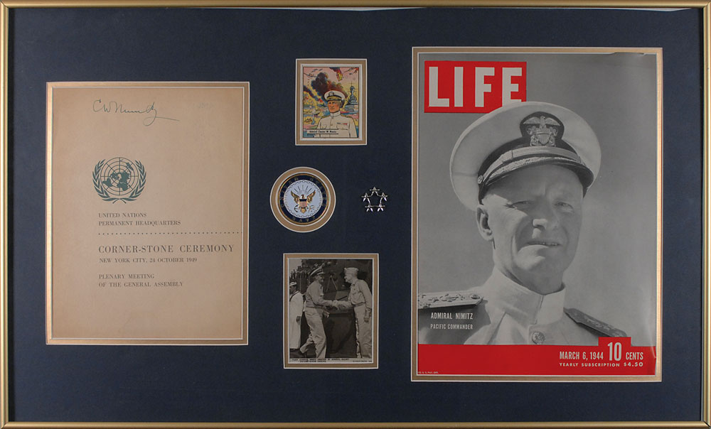 Vintage program cover from the United Nations Corner-Stone Ceremony, held in New York on October 24, 1949, 8 x 10.5, signed at the top in blue ink, “C. W. Nimitz.” Double-matted and framed with a Life magazine cover, two other images of Nimitz, a Navy medallion and five-star cluster to an overall size of 30.25 x 18.25. In fine condition, with a uniform shade of mild toning, and some light dampstaining along bottom edge. Oversized. RR Auction COA.