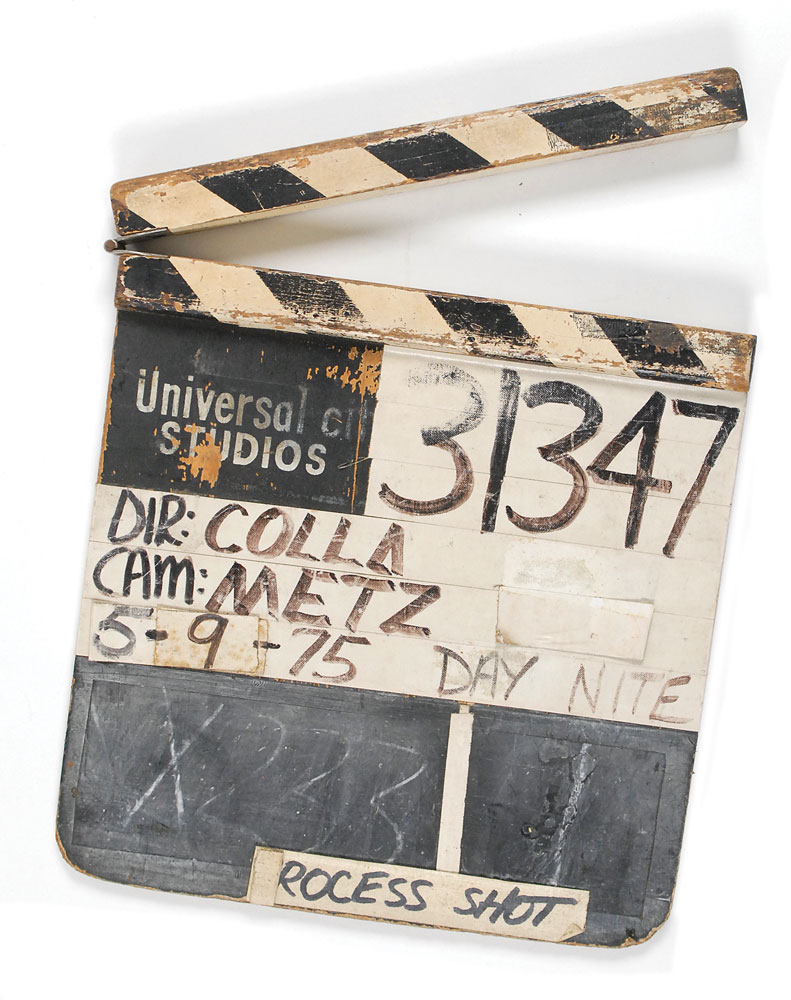 Original Universal Studios clapper board used in the production of the 1975 made-for-TV film The UFO Incident. Board measures 11 x 12, and is labeled with the identification number “31347,” and crew, “Dir: Colla, Cam: Metz,” dated May 9, 1975. A piece of tape affixed to the bottom reads, “Process Shot.” In fine condition, with expected heavy overall wear from use. Directed by Richard A. Colla, the film starred James Earl Jones and Estelle Parsons. RR Auction COA.