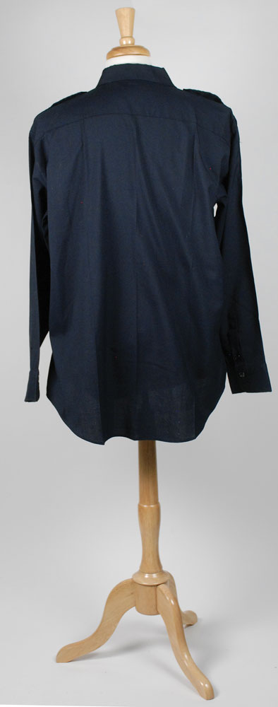 Police uniform shirt worn by Ed Herlihy in Police Academy 2. Dark blue long-sleeve shirt has a button-up front and two front pockets. Written in white ink inside the collar is “Dooley WB72317,” and shirt also bears a manufacturer’s tag sewn into collar. Adhesive remnants to shirt from removed badges and patches, otherwise fine condition. Accompanied by a certificate of authenticity from Hollywood Movie Costumes. RR Auction COA.