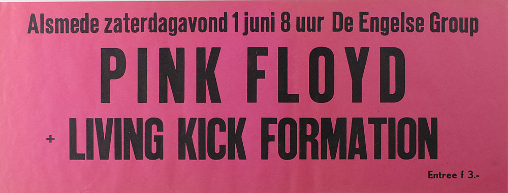 Original and early color 25.5 x 10 German concert poster for Pink Floyd and Living Kick Formation. In fine condition, with some light ripples and creases. Rolled. RR Auction COA.