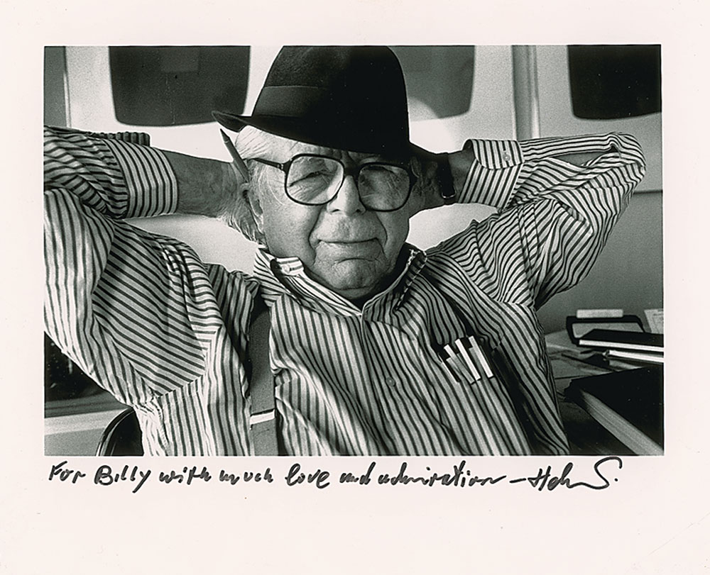 Glossy 11.75 x 9.5 portrait of filmmaker Billy Wilder, signed and inscribed to Wilder in the lower border in black ink, “For Billy, with much love and admiration—Helmut.” In fine condition, with a crease to the lower right corner (not affecting image or signature). RR Auction COA.