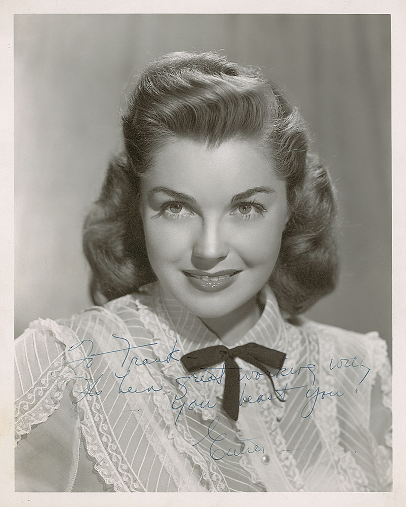 Lovely vintage matte-finish 8 x 10 photo of Williams, signed and inscribed in blue ballpoint, “To Frank—It’s been great working with you—you beast you! Esther.” In fine condition, with some irregular ink adhesion to areas of the inscription. The inscribee, Frank Radcliffe, was an actor and dancer on several films including Hello Dolly, Gentlemen Prefer Blondes, The Band Wagon, and My Fair Lady. Pre-certified PSA/DNA and RR Auction COA.