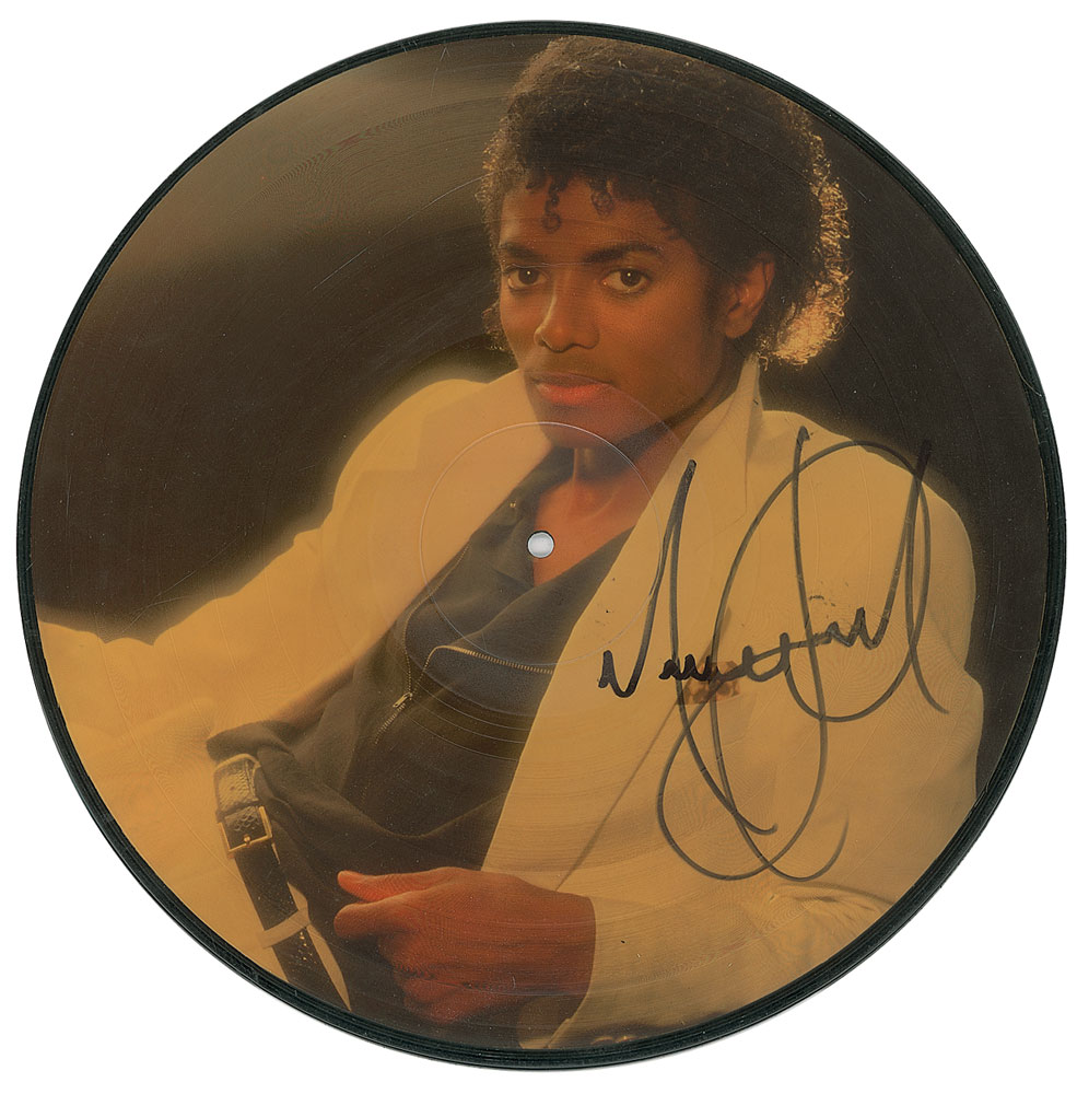 Uncommon Thriller picture disc, with an image of Jackson on either side, signed on each side on black felt tip. In fine condition. Pre-certified Roger Epperson/REAL and RR Auction COA.