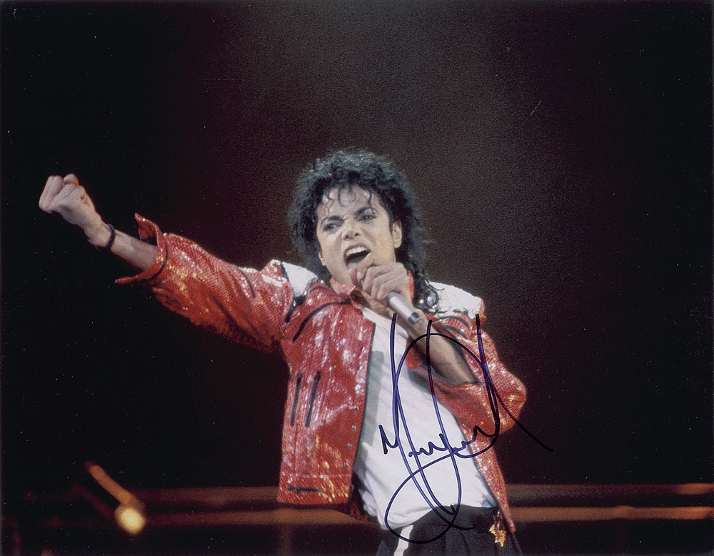 Color glossy 14 x 11 photo of Jackson belting out a tune on stage in his trademark red sequined jacket, signed in black felt tip. In very fine condition. Pre-certified Roger Epperson/REAL and RR Auction COA.