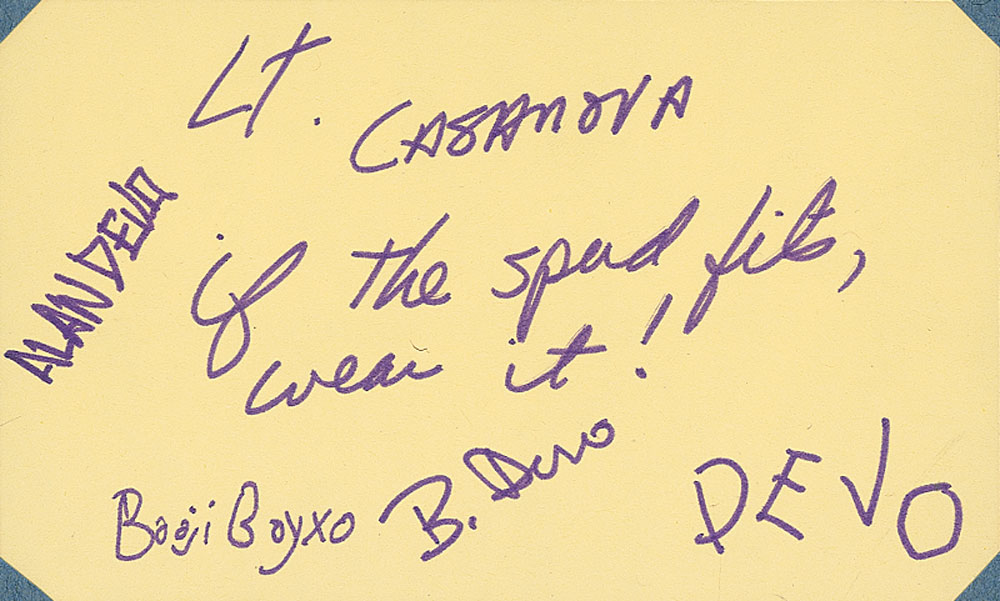 Early in-person felt tip signatures, “Alan Devo,” “Lt. Casanova,” “B. Devo,” and “Booji Boyxo,” on a yellow 5 x 3 card, with one member adding the band’s name and “if the spud fits, wear it!” Card is removably attached by its corner tabs to a larger sheet, along with a group photo, in turn removably attached to a 8 x 9 sheet. In fine condition. RR Auction COA.