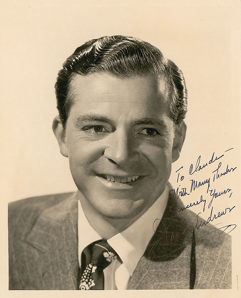 Handsome vintage sepia matte-finish 8 x 10 photo, signed and inscribed in fountain pen, “To Claude—With many thanks, Sincerely yours, Dana Andrews.” In fine condition, with a few unobtrusive staple marks and holes to border areas. Pre-certified PSA/DNA and RR Auction COA.